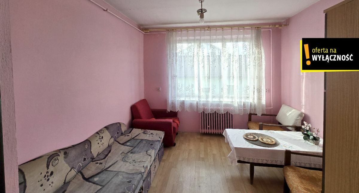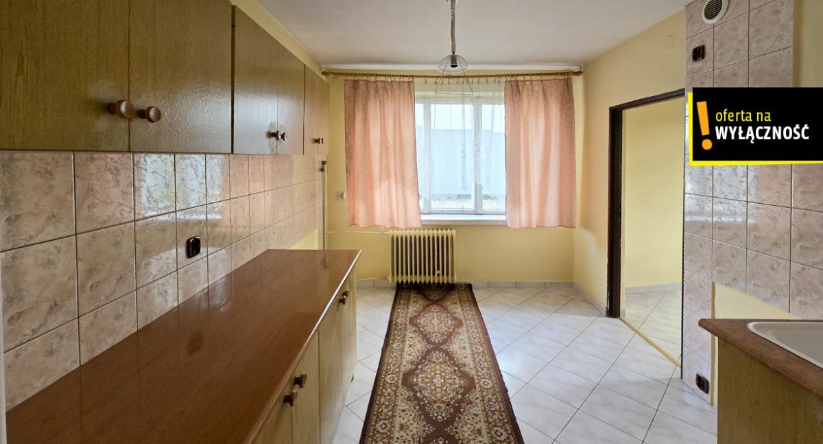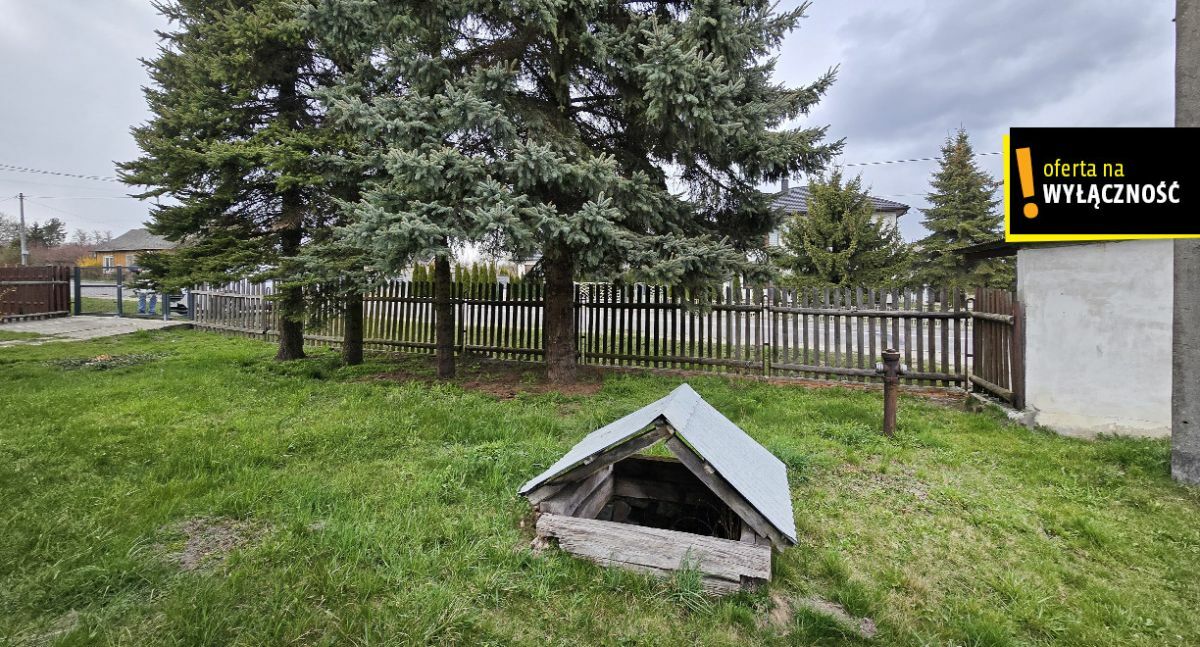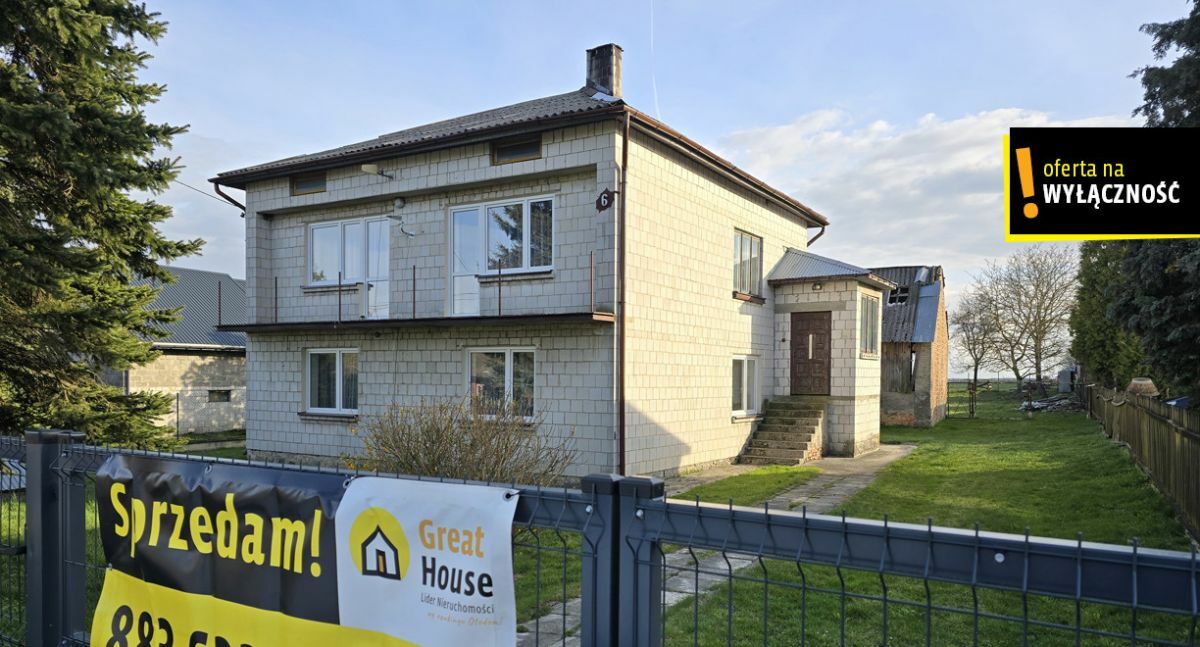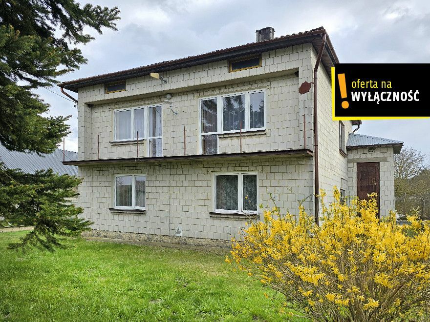 Budynek wybudowany w 1985 roku z cegły silikatowej, kryty eternitem, część okien wymieniona na pcv. Budynek ogrzewany piecem na paliwo stałe, kocioł wymieniony w 2024 roku Sas na węgiel + drzewo V generacji, w pokoju i kuchni piec kaflowy. Działka w całości ogrodzona, część siatką, przód brama stalowa panelowa zamontowana w 2024 roku. Na działce dodatkowo znajduje się budynek gospodarczy wraz ze stodołą do remontu. Z przodu działki rosną duże świerki osłaniające budynek od drogi, po prawej stronie wsunięty w działkę przystanek PKS. Na działce rosną drzewa owocowe, 4 orzechy śliwki, studnia do podlewania roślin. Dom sprzedawany jest z umeblowaniem, parter w zależności od preferencji użytkownika raczej do remontu, piętro wyremontowane, budynek wymaga docieplenia.